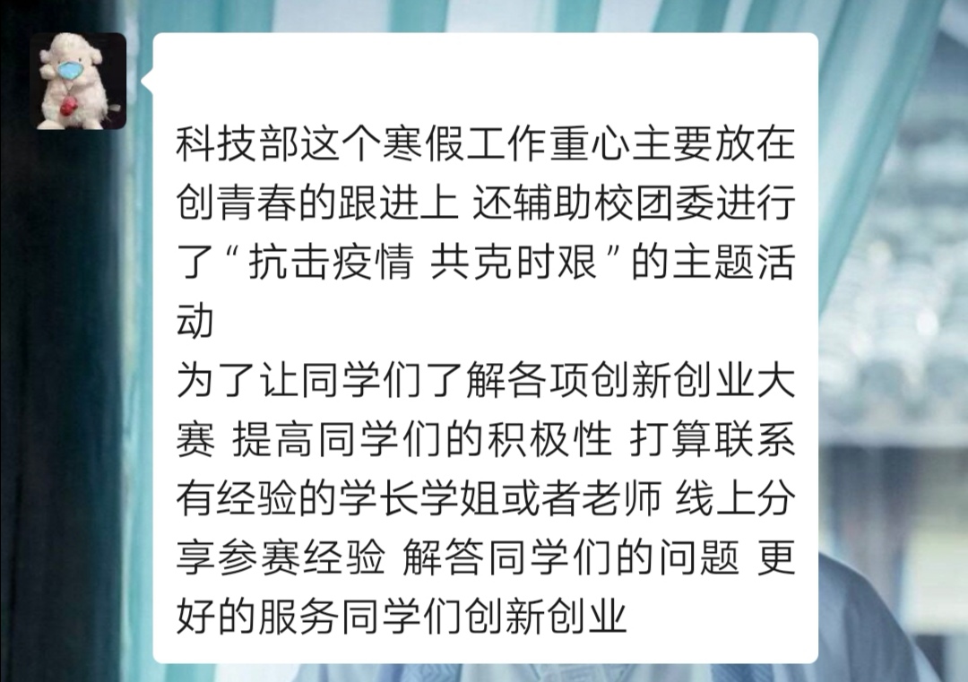 会议最后,李鑫老师进行了总结发言。首先,李鑫老师对各部门在疫情期间的工作和努力表示肯定,鼓励大家在现有的基础上充分发挥创新和改造能力,更加完善本部门工作;其次,她对于团委下一阶段的几个重要活动提出建设性的意见;最后,她希望同学们在防疫期间做好防护,团结一致,共克时艰。此次会议之后,437必赢会员中心团委也必将在线上做好新学期各项工作、继续承担好团委责任!