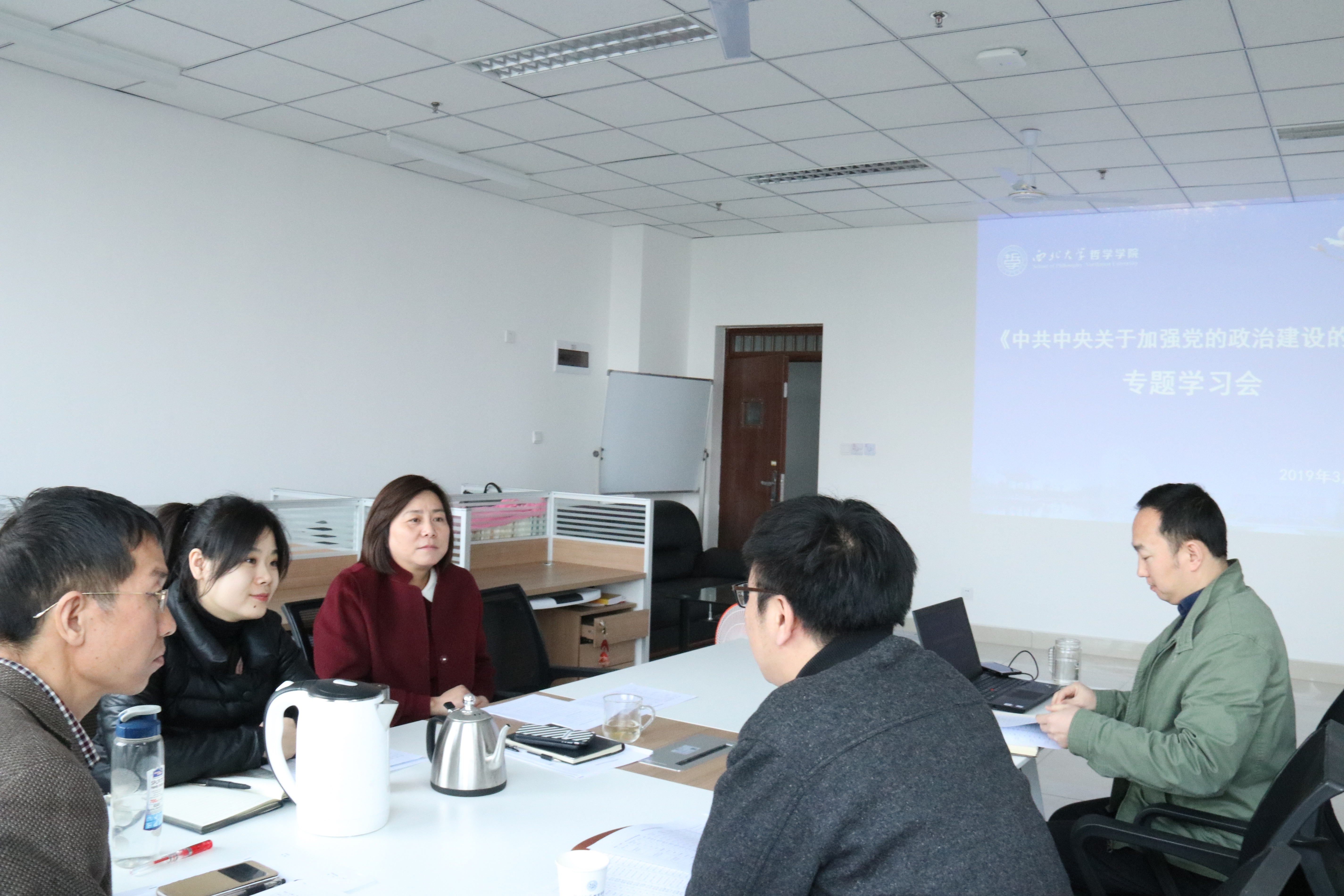 学院党委负责人指出,《中共中央关于加强党的政治建设的意见》等文件的制定是对新时代管党治党生动实践的又一次深入总结,在推动党的建设制度化、科学化、规范化上迈出了新的步伐,为我们加强新时代党的建设提供了新的遵循。全院师生党员一定要对《意见》进行深入学习,提升对党的政治建设重要性的认识,坚定政治信仰,牢固树立“四个意识”,坚定“四个自信”,坚决做到“两个维护”。